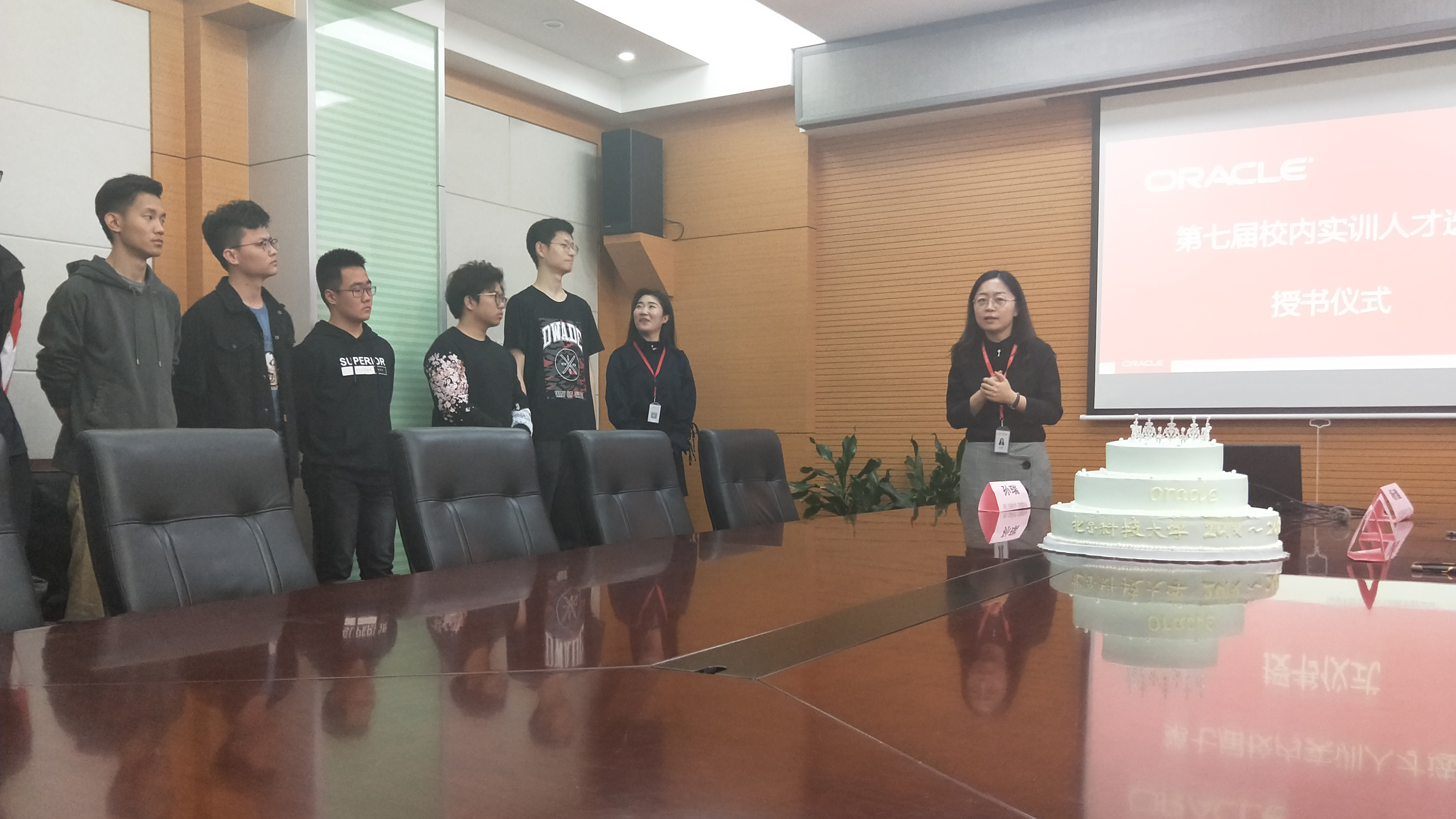 随后,授书仪式进入最重要的环节,通过人才选拔的同学们在全场祝贺的掌声中依次上台,接过由孙总监亲自颁发的录取通知书,并合影留念。在最后,出席此次授书仪式的老师及同学们共同切开代表祝贺与祝福的蛋糕,授书仪式在现场的欢声笑语中圆满成功。