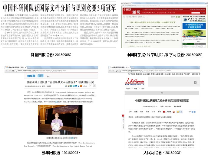 在2013年国际文档分析与识别大会技术竞赛上,我们的创新技术获得本届大赛最受关注的Robust Reading Competition竞赛“自然场景文本检测”、“网络图片文本检测”、和“网络图片文本提取”三项冠军。其中,“网络图片文本提取”和“网络图片文本检测”获胜结果性能比第二名分别提高了19.36%和8.37%。