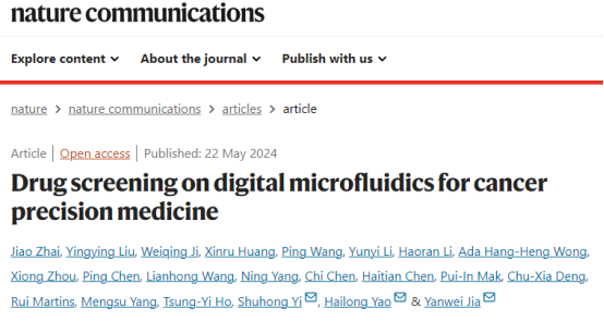 近日,我院先进计算与集成电路设计实验室姚海龙教授、冀伟清副教授团队与澳门大学、中山大学合作者在《Nature Communications》上发表了题为“Drug screening on digital microfluidics for cancer precision medicine”的研究文章。