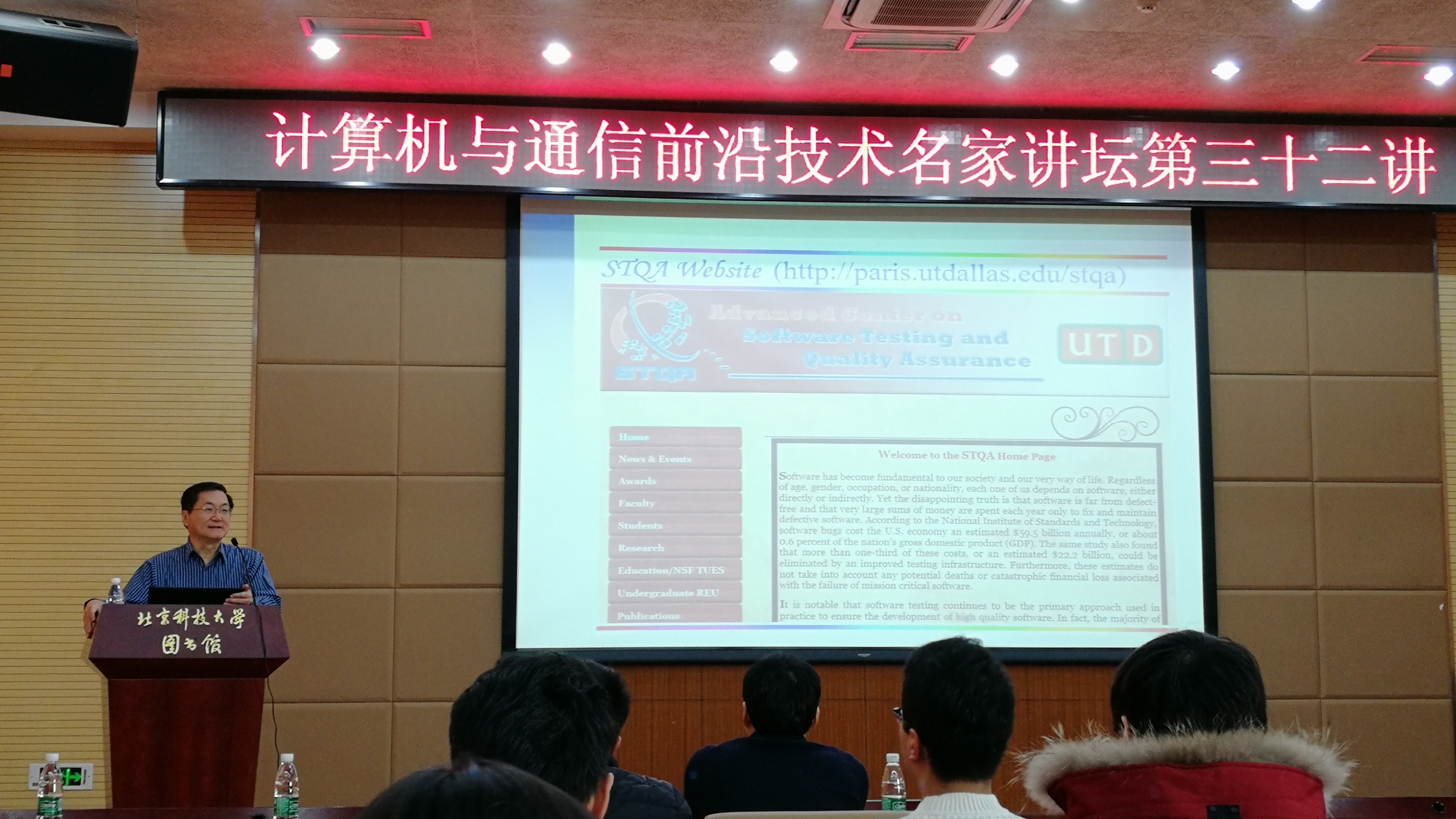 2017年12月15日上午,计算机与通信前沿技术名家讲坛第三十二讲在我校图书馆四层报告厅成功举办。Eric Wong教授为广大师生带来题为“组合测试及其应用”的精彩学术讲座。报告会由孙昌爱教授主持, 百余名师生参加了此次报告会。