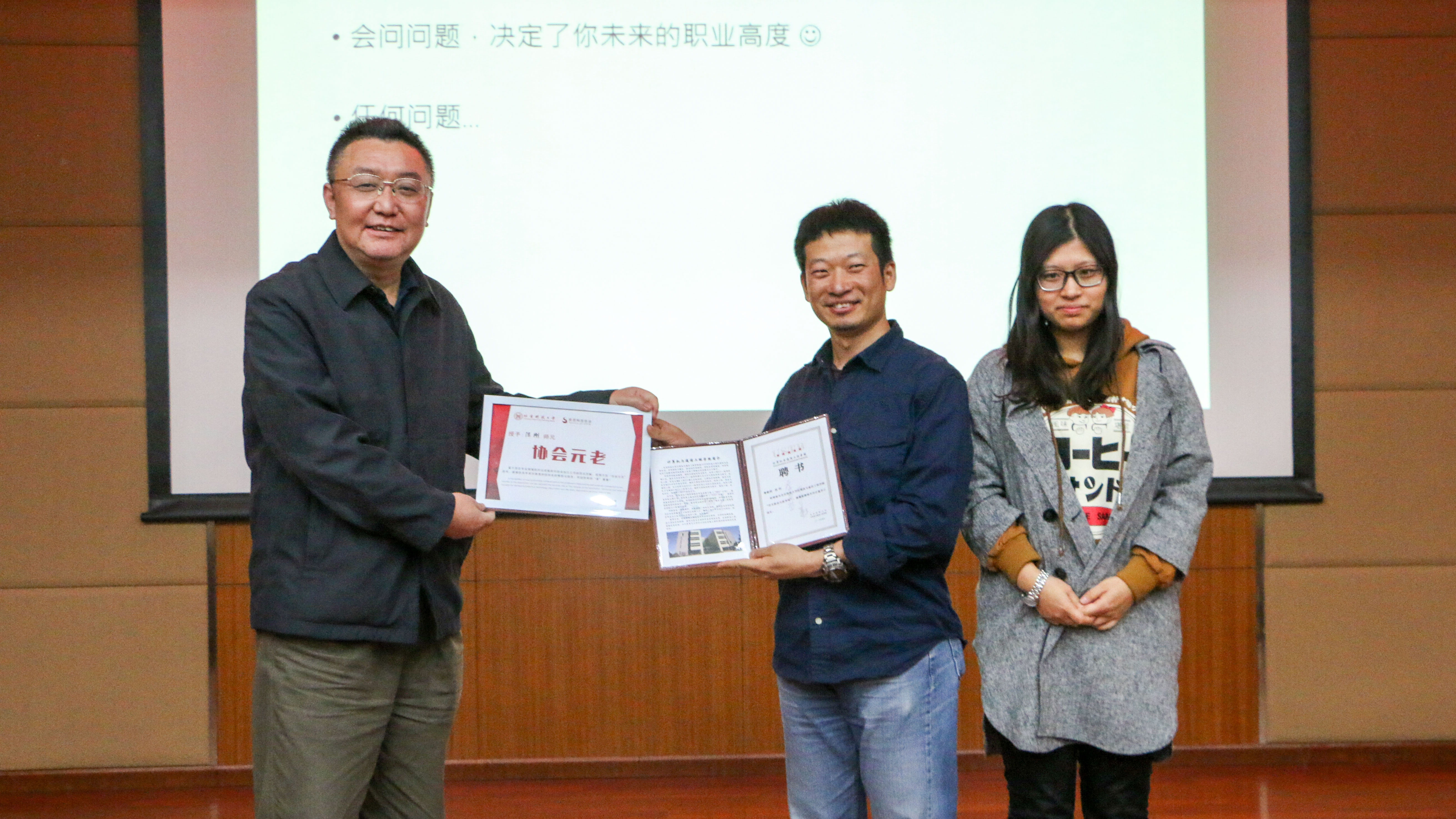 会聘任杰出的校友和企业专家作为学生的职业生涯导师,从而更好地帮助同学们开展自身规划。在交流会的尾声,王宗杰为陈刚校友颁发学生职业生涯导师聘书以及题有“索思元老”的证书。