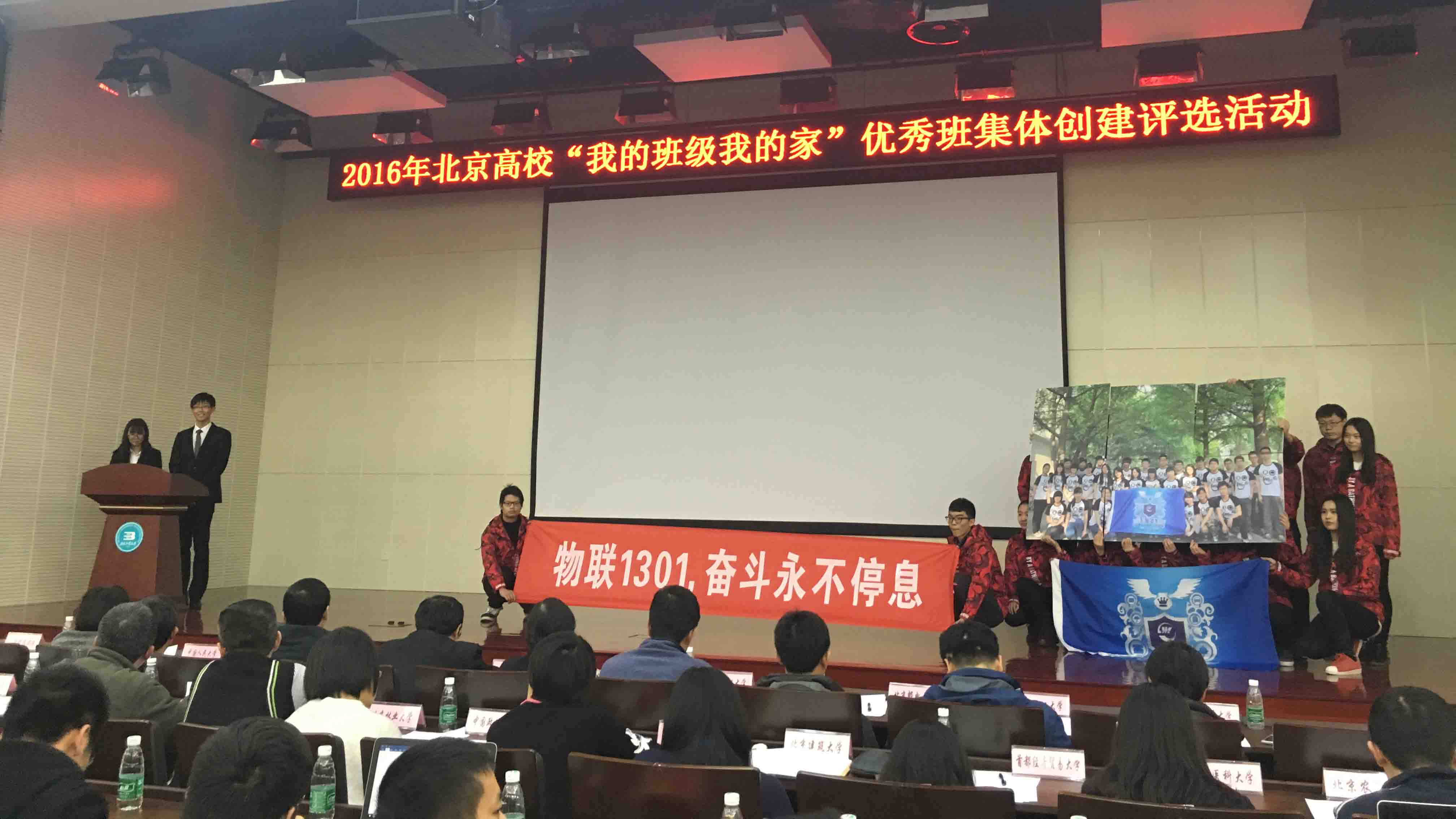 北京高校“我的班级我的家”优秀班集体评选活动由中共北京市委教育工作委员会主办,该项活动至今已举办七届,是目前北京市唯一以高校班级为单位开展的评比展示活动。今年的活动共分为学校推荐、网络展示、专家评审和现场答辩四个阶段。经过层层筛选,物联1301班进入市级“十佳”示范班集体称号答辩评选环节。
