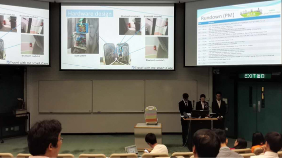 本次比赛邀请了香港政府、企业、高校等各领域工程师、学者作为评委,与海内外共40支团队一起畅谈未来城市智能与环保的议题。我校学生设计的智能旅行箱拥有微控制智能跟随、蓝牙三角定位技术、GSM智能远程呼叫报警、手机app信息控制等功能,以灵活省力、绿色节能的特点给在场的嘉宾留下了深刻印象,在自由问辩的环节更是引起了在场师生的热烈讨论。赛后同学们纷纷表示,思维的碰撞为他们带来了灵感,比赛获奖的同时也为作品的进一步提升做好了规划。