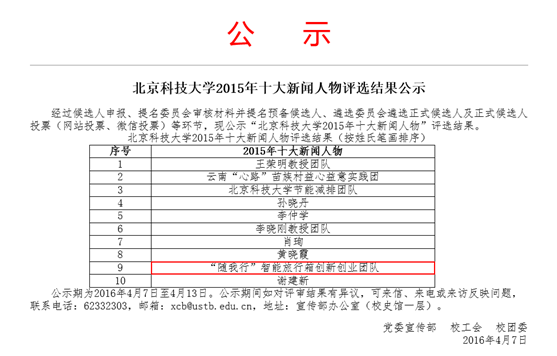 此前,他所指导的团队项目“随我行 Smart iCase智能旅行箱”荣获第十二届“北京科大科技园杯”学生创业竞赛金奖、2015年TIC100智慧城市与物联网创新创业大赛一等奖、第九届国际大学生iCAN创新创业大赛总决赛二等奖,并且在第十四届“挑战杯”全国大学生科技竞赛“智慧城市”专项赛的600余件作品中脱颖而出,获一等奖。在第三届贝壳青年科技文化节开幕式中,该作品作为我校科技创新项目代表亮相。截止目前为止,作品已经获得包括建龙基金在内的总额150,000元种子期投资。这些荣誉也为其成为2015年度科大十大新闻人物奠定基础。