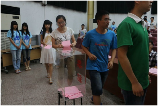 随后,会议进入了紧张严肃的演讲环节。在院学生会副主席袁越同学宣读选举办法和监票人、计票人名单之后,前期通过答辩入围选举大会的11位主席团候选人慷慨陈词,激情展示自己的竞选优势和工作设想,并抽取问题进行作答,现场气氛也随之高涨。演讲完毕后,由总监票人袁越同学主持选举环节,来自各班的93名学生代表行使参与民主管理的权利,将自己神圣的一票投入到投票箱中。投票过后,辅导员蒋灵斌、陈凯、马力、王基镔悉心地对每一位候选人的演讲表现进行点评。最后,经过认真而紧张的计票,主持人宣布了投票选举结果以及拟当选的学院第四届团委、学生会主席团成员名单。