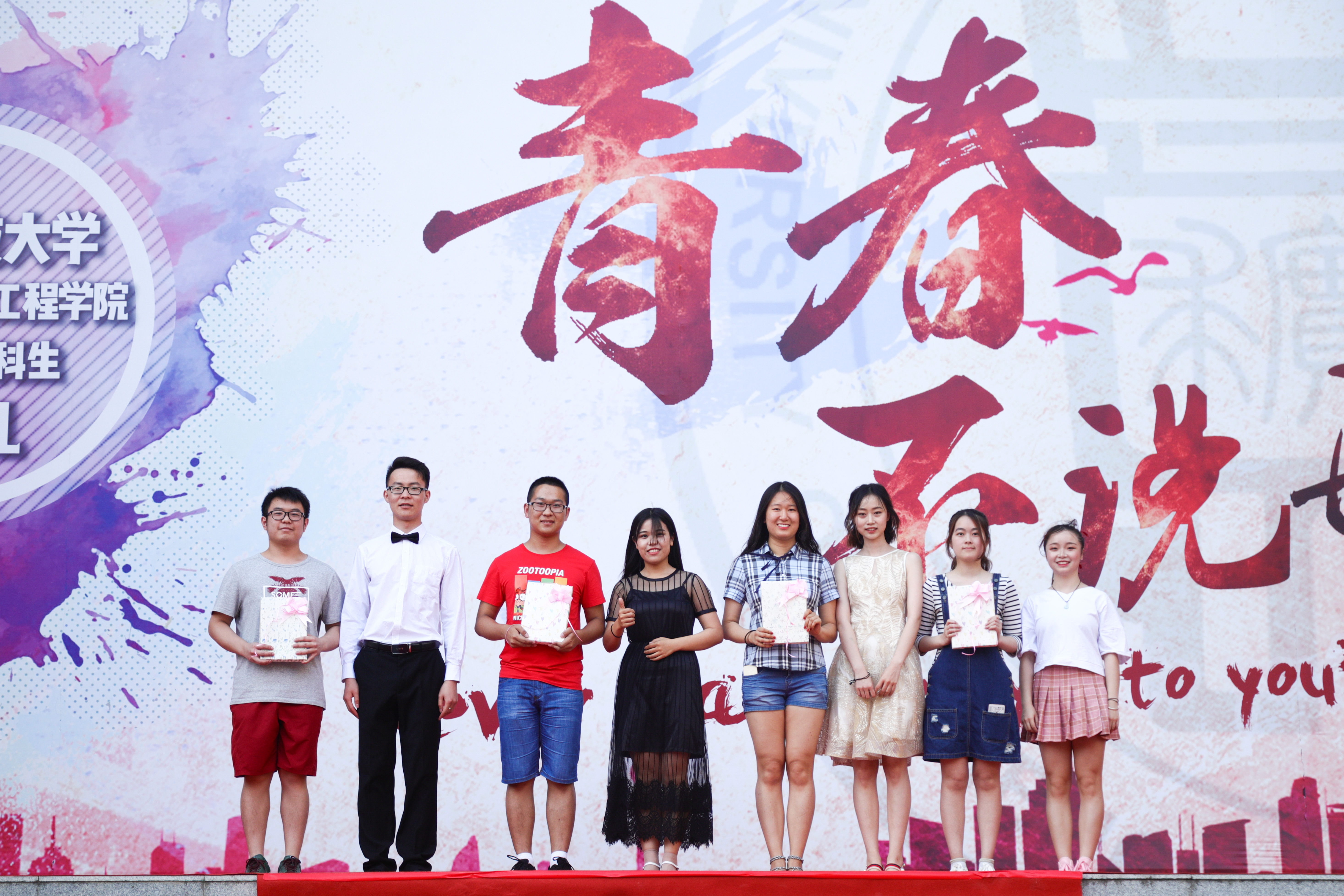 参与“图书漂流”活动的毕业生代表上台为学弟学妹赠送图书并接受捐赠证书。