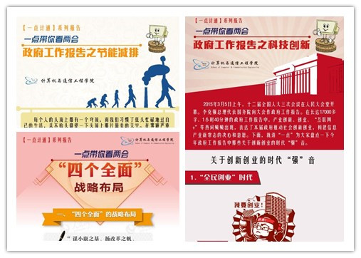 结合互联网专业特色进行了“一点”解读,先后推出了“一点聊两会”系列之“创新创业的时代‘强’音”、“大数据里的节能减排”、“影响未来的‘四个全面’”三期内容,通过微信、QQ等新媒体和学院大厅网上网下对两会精神进行宣传解读,引发了计通学子的关注和热议。