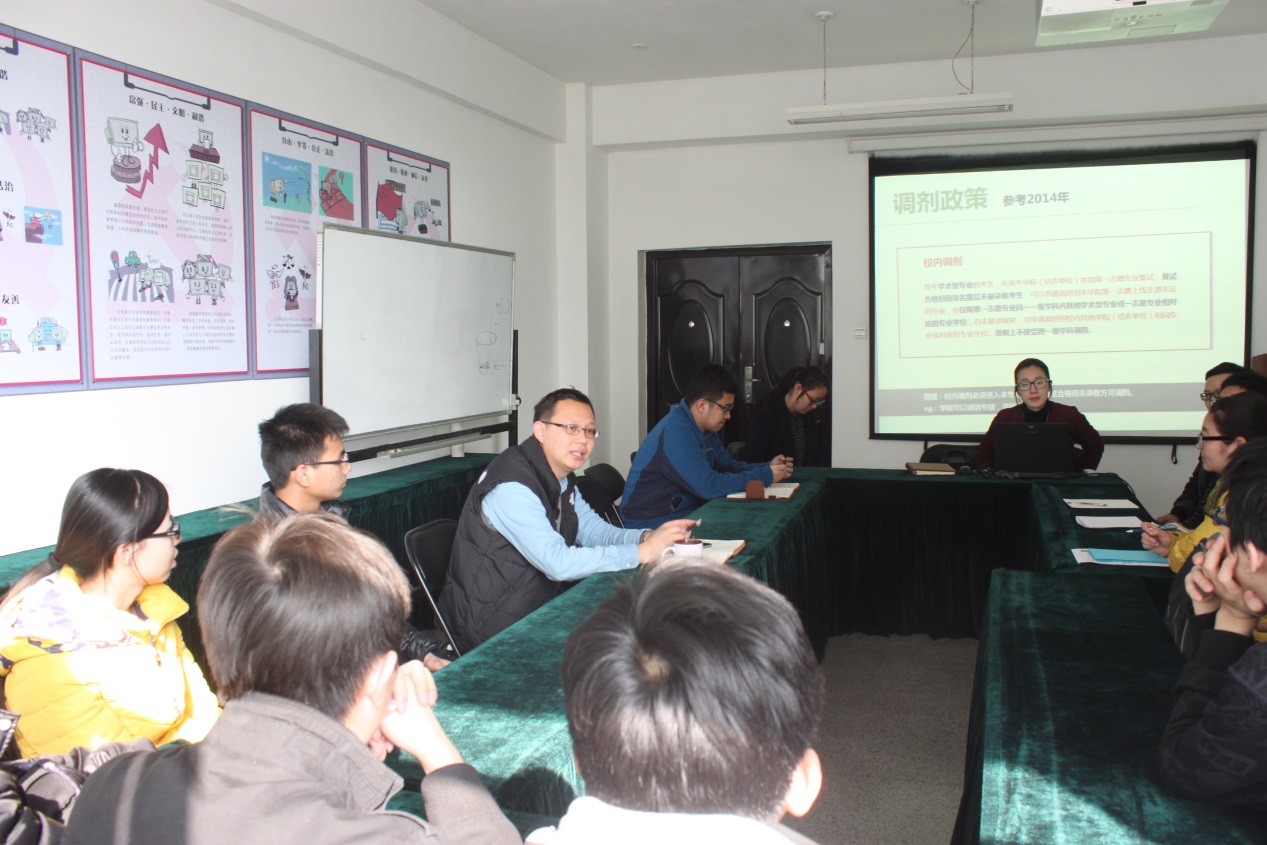 会前,11级辅导员赵雅楠与李毅萍分别同各班考研同学进行了深入的交流,全面掌握了考研学生目前的基本状况以及问题,并总结整理了近四年海角社区 考研学生调剂去向以及近段时间学校学院的各类调剂信息。会上,几位老师对往年同学调剂的基本流程以及方法做了详细的阐释并为同学们解读了调剂的基本注意事项,帮助大家寻找理想的调剂学校,苏栋老师用具体数据说话,详细的向同学们介绍了近几年海角社区 的就业情况以及大四最后阶段如何通过有效途径获取就业机会以及就业相关工作的注意事项等,鼓励大家关注就业信息,积极主动争取面试机会。