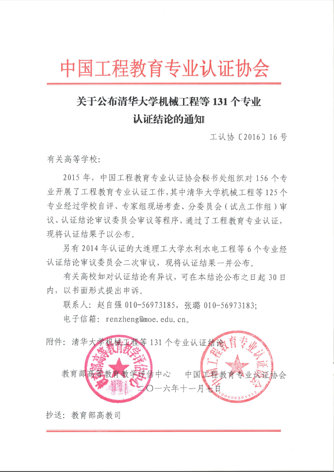 近日,教育部高等教育教学评估中心、中国工程教育专业认证协会发布《关于公布清华大学机械工程等131个专业认证结论的通知》,我院计算机科学与技术专业经过学校自评、专家组现场检查、分委员会(试点工作组)审议、认证结论审议委员会审议等程序,通过了工程教育专业认证,有效期3年(2016 年1月至2018年12月)。